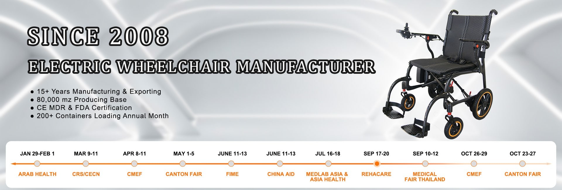We have production area of 80,000 square meters with 195 sets advanced equipments to provide OEM & ODM and customization service, fast delivery and stable quality lead to 50,000pcs electric wheelchairs annual selling to more than 80 countries.
